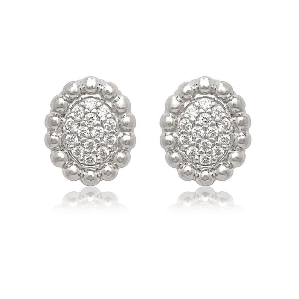 Sterling Silver Small Oval CZ with Beaded Border Stud Earrings
