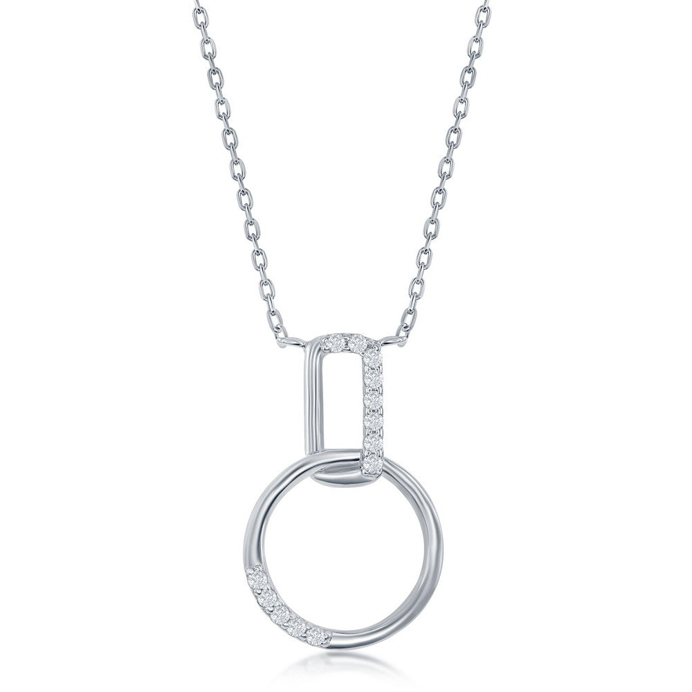 Sterling Silver Interlocking Circle And Rectangle Design Necklace With Cz Stones On An Adjustable 16-18 Inch Chain With A Lobster Style Clasp