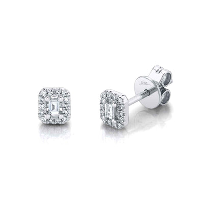 Shy Creation, 14 Karat White Gold Baguette Diamond Stud With A Round Diamond Halo, 0.12Cttw. G-H, Si