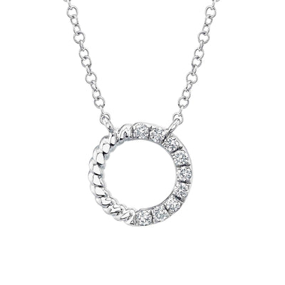 Shy Creation, 14 Karat White Gold, Circle Necklace, With A Half High Polish Braided Style Design And Half Diamond Design, 0.12Cttw. G-H, Si1-Si2